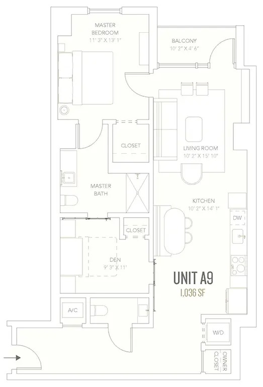 Then last but not least the A9 floor plan. It is a one-bedroom with one bath but with a den and a half bath. So you have a hallway when you come in the kitchen and living area looking out to the west to Town Lake and downtown Austin. It has the most private balcony because it’s in-set, the master bedroom has that window facing west as well. And then it comes with a little desk by day and Murphy bed by night so it can sleep as many guests as a two-bedroom and this is priced between 770K and 845K.