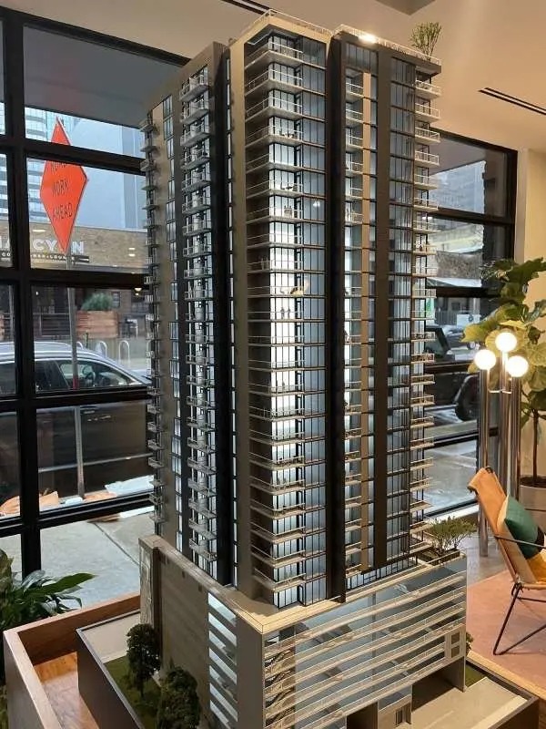 So the first floor will be the lobby and then the coffee bar lounge. The second floor to the ninth floor is where the parking garage will be. The 10th-floor pier will have the indoor fitness center, outdoor fitness lawn, a gated dog park, and then on the north side of the 10th floor will be a yoga studio. Floors 11 to 32 are all the condominiums and there are 249 units total.